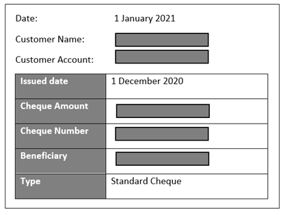 A Standard Stop Cheque is automatically linked to the customer’s transactional account.