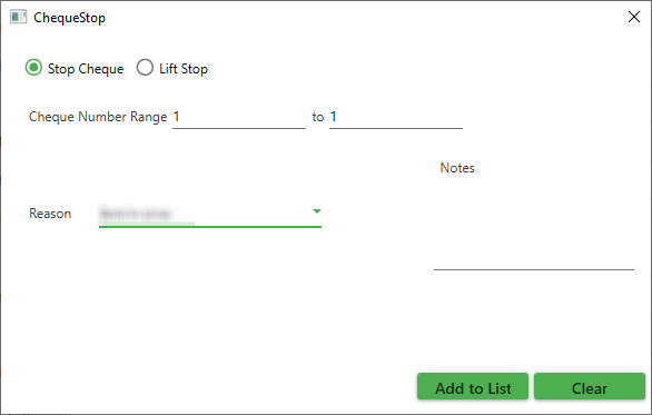 Note: The Cheque Serial Number To field will automatically prepopulate with the cheque number when you click on Add To List. By leaving this field blank, you will reduce any mistyping errors. Only use the ‘to’ field if you are stopping an multiple cheques in sequential order eg. An entire cheque book from cheques 000001 to 000050.